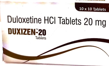 DUXIZEN-20 contains Duloxetine Hydrochloride 20 mg, a serotonin-norepinephrine reuptake inhibitor (SNRI) known for its effectiveness in managing major depressive disorder (MDD), generalized anxiety disorder (GAD), and certain forms of chronic pain such as diabetic neuropathy and fibromyalgia. By boosting key neurotransmitters (serotonin and norepinephrine), DUXIZEN-20 addresses both emotional and physical symptoms, offering a comprehensive approach to patient care.