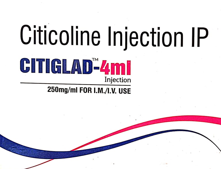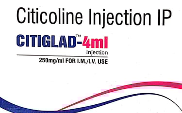 CITIGLAD-4ml is a neuroprotective injection containing Citicoline 250 mg/mL, compliant with Indian Pharmacopoeia (IP) standards. Designed for intramuscular (I.M.) or intravenous (I.V.) administration, it aids in cellular repair and cognitive restoration following brain injuries, strokes, or neurological disorders.