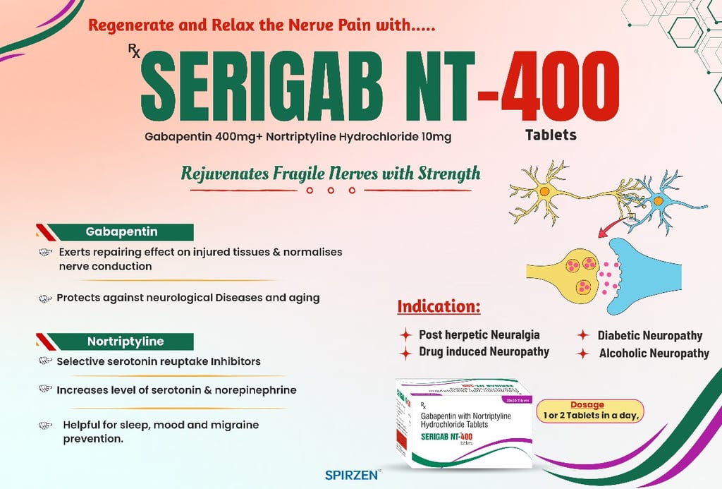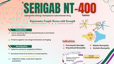 SERIGAB NT-400 is a carefully formulated combination of Gabapentin and Nortriptyline designed to address neuropathic pain at its core. By modulating nerve signals and enhancing neurotransmitter balance, this dual-action therapy helps alleviate pain, improve nerve function, and support better sleep and mood.